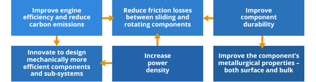 The diagram below illustrates the key role played by friction and wear reduction technologies, in improving the efficiency and durability of today's automotive systems. Friction and wear are largely surface phenomena and hence the choice of the appropriate surface engineering technologies that can minimize both friction and wear of mechanical components is crucial for meeting the current and future automotive performance standards.