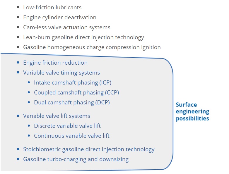 To achieve higher performance standards, engine design has continued to evolve. Innovations in valve train design; gasoline turbo-charging; engine downsizing; direct injection technology etc. are placing increasing mechanical and thermal stresses on many engine components. As shown below, several of these recent automotive engineering innovations can benefit significantly from specialized surface engineering technologies.